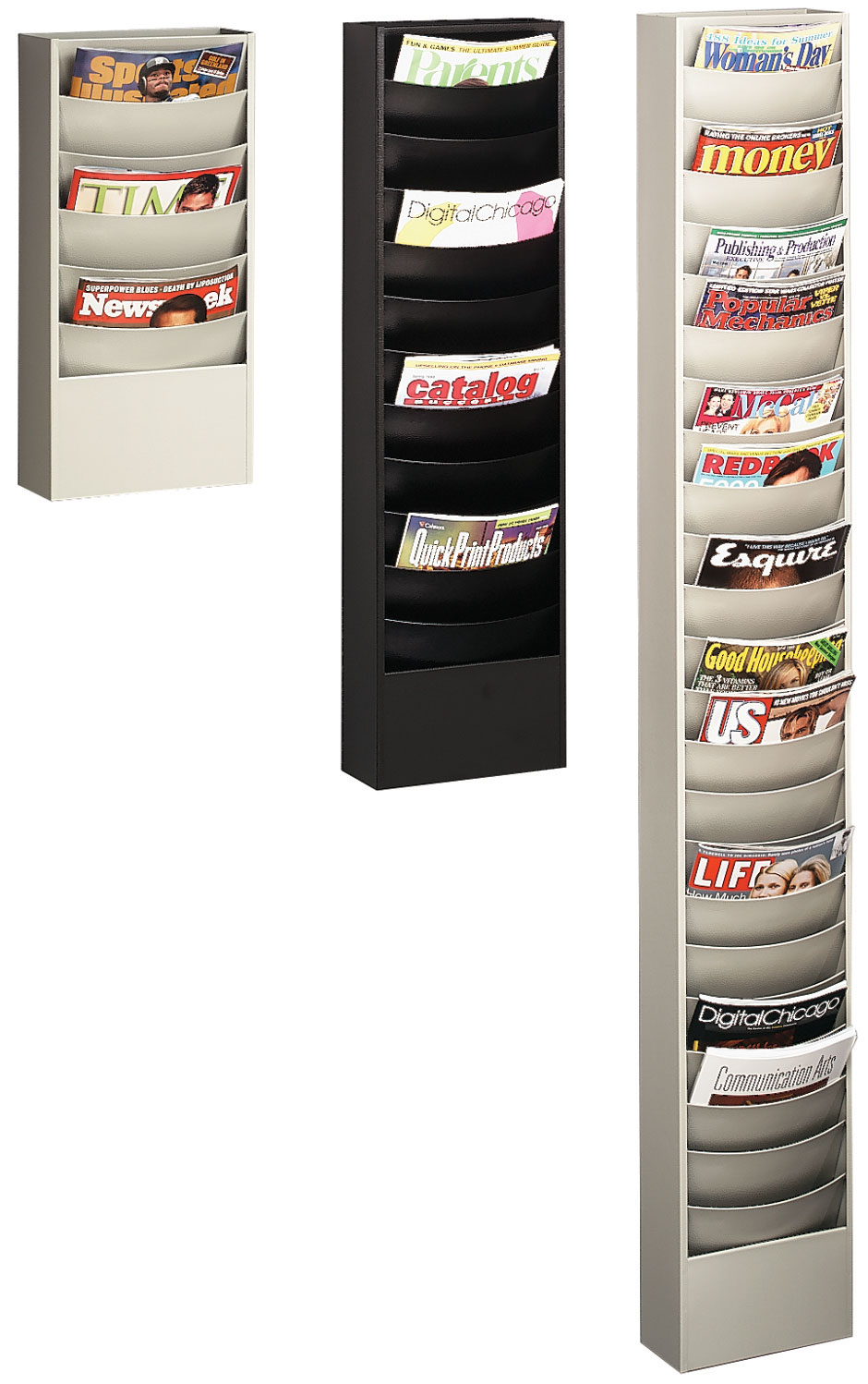 The Eclipse Line of space-saving wall racks feature attractive curved pockets so magazines and forms hold their shape and stay upright. Eclipse Racks are modular to allow for the combination of units to create a custom display. Slotted for easy mounting. Available in 5, 11, and 23 pocket models. Pockets measure 9-1/8" w x 3/4" d x 10-5/8" h. Made from 30% Post-consumer recycled steel. Available in Black (-4), Putty (-6), Platinum (-32), and Charcoal (-42).