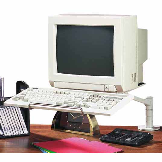 Supports monitors up to 55 lbs. Platform height adjusts from 5-1/2" to 8-1/2" for comfortable viewing. Easy, fluid single-handed motion. Arm rotates 180° at base. Monitor platform rotates 360° and tilts +/-5°. Chrome keyboard holder extends 11". Easy-mount clamp fits overhangs from 7/8" to 2-7/8" wide. Platform Dimensions: 11-9/16"x11-9/16". Wall mountable.